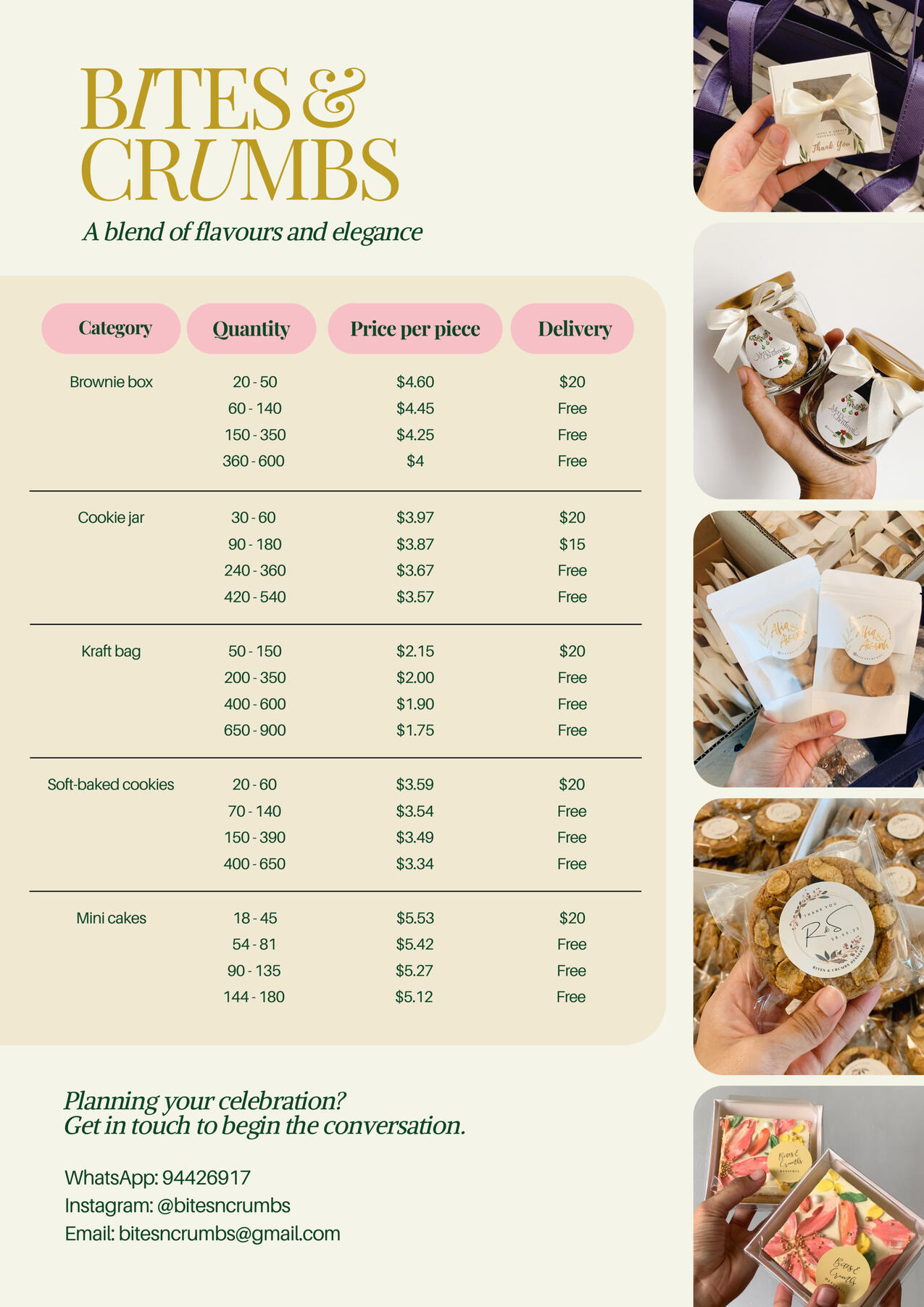 Celebrating ten years of crafting sweetness from the heart, Bites & Crumbs Desserts started it’s journey with a simple desire - to infuse joy into every bite and experience. From our cakes to daily delights, our motto “brewing a blend of flavors and elegance" guides our unwavering commitment to quality, taste and aesthetics.