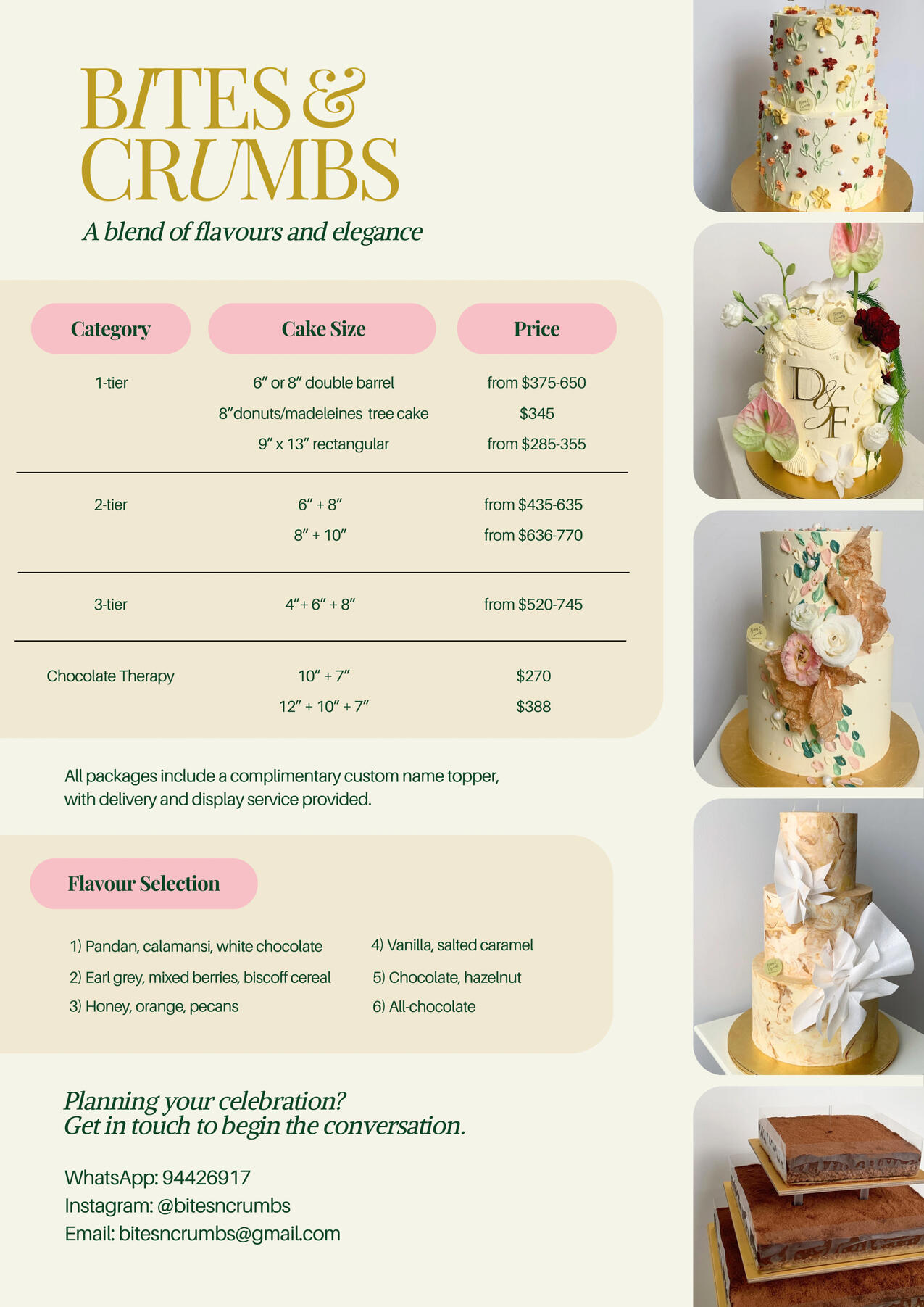 We believe in creating original designs at B&C and we will not copy the exact design of others. Cake decorating is a creative process so please expect spontaneous, subtle changes to the inspired photos shared during discussion so as to make your cake bespoke and unique just for you.